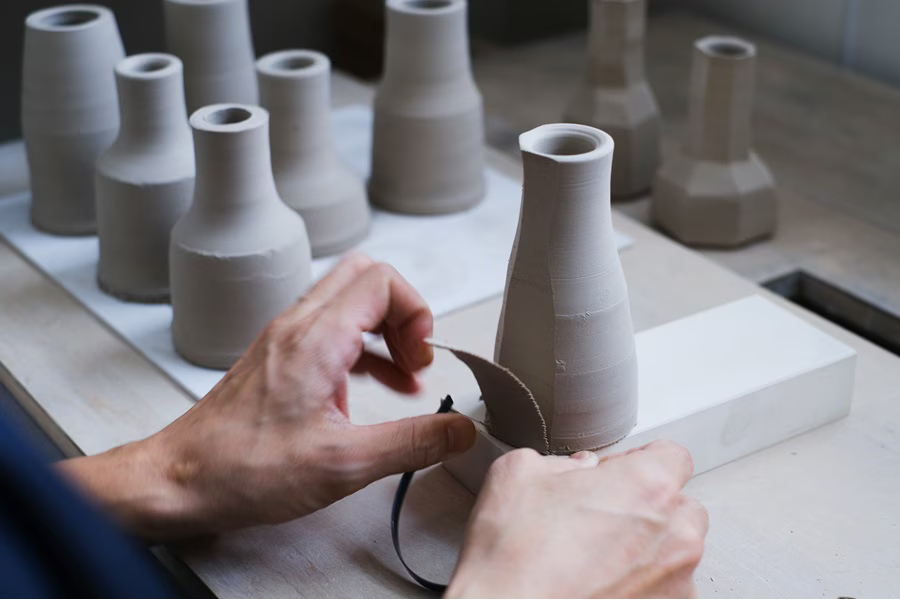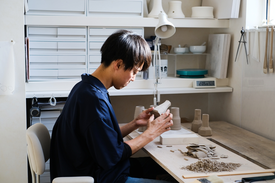 七飯町の陶芸家、竹田武司さんが作るのは、釉薬を使わない「無釉白磁」と呼ばれる手法で作るうつわたち。